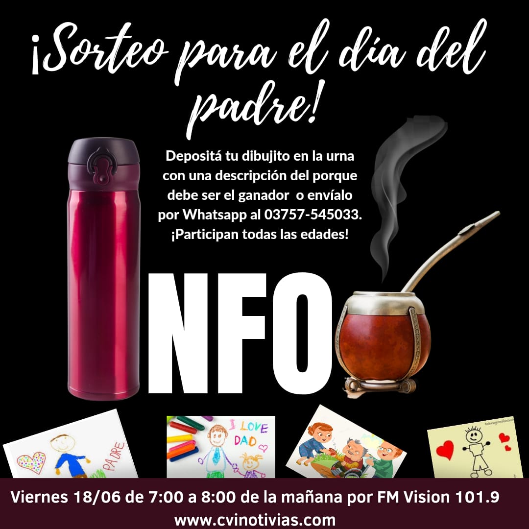El programa InfoMate que se emite de lunes a Viernes por FM Vision de 7:00 a 8:00 de la mañana con la conducción de Micaela Ferraz, este viernes 18 de Junio está realizando un programa especial por el día del padre con exelentes sorteos