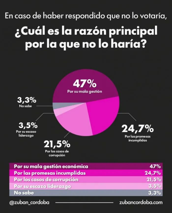 El informe detalla que el descontento no responde a un solo factor, sino a una combinación de variables económicas y éticas. Un 47% de los consultados atribuye su postura a una percepción de mala gestión, mientras que un 24,7% señala promesas incumplidas. No obstante, el dato que ha ganado peso en los últimos días es la corrupción, mencionada por más del 20% como un factor determinante en el deterioro de la figura presidencial.