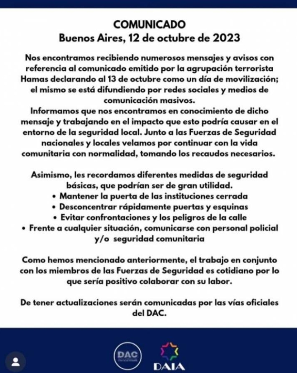 A partir de esto es probable que haya eventos de protesta en varios países del mundo, que pueden convertirse en eventos violentos. A la luz de esto, el Cuartel General de Seguridad Nacional y el Ministerio de Asuntos Exteriores recomiendan que todos los israelíes que se encuentran en el extranjero estén atentos,en cualquier parte del mundo se mantengan alejados de manifestaciones y protestas y, si es necesario, se pongan al día con las fuerzas de seguridad locales sobre posibles manifestaciones/eventos de desorden en sus alrededores.