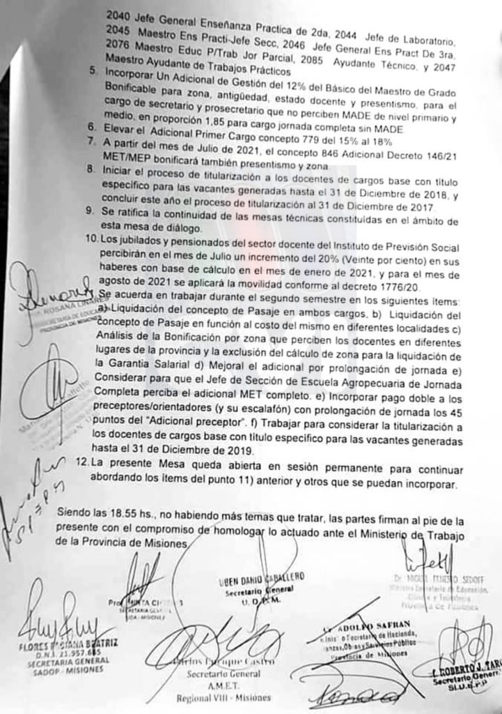El ministro de Educación de Misiones, Miguel Sedoff encabezó este lunes por la tarde, en el salón Oval de esa cartera, una reunión con representantes de los distintos sindicatos y gremios. En ella las partes acordaron elevar desde este mes el básico al 70%, por lo cual el piso para el maestro de grado será de 17.741,77 pesos.