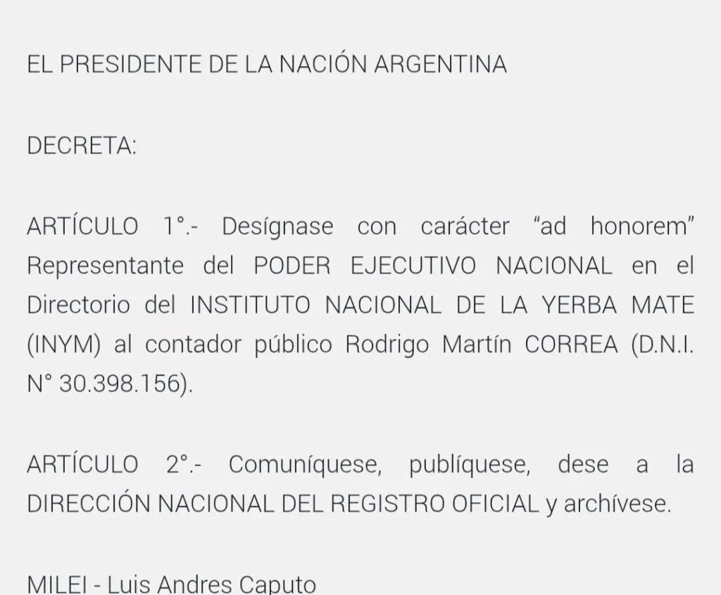 El Gobierno nacional oficializó este miércoles la designación del contador público Rodrigo Martín Correa como representante del Poder Ejecutivo Nacional en el Directorio del Instituto Nacional de la Yerba Mate (INYM). La medida quedó formalizada a través del Decreto 873/2025, firmado por el presidente Javier Milei y el ministro de Economía Luis Caputo, y establece que el cargo será desempeñado con carácter ad honorem.