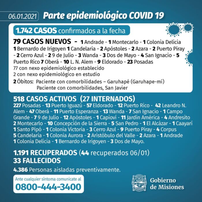 Además, de acuerdo a lo informado por la cartera sanitaria misionera, se confirmaron 79 nuevos casos positivos de la enfermedad y la cantidad de infectados se eleva a 1.742.