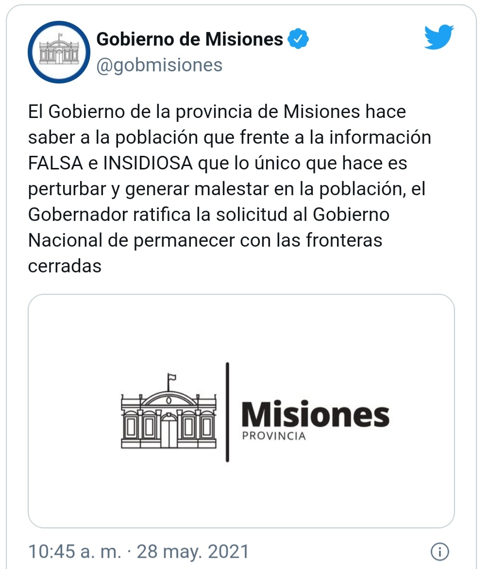“El Gobierno de la provincia de Misiones hace saber a la población que frente a la información FALSA e INSIDIOSA que lo único que hace es perturbar y generar malestar en la población, el Gobernador ratifica la solicitud al Gobierno Nacional de permanecer con las fronteras cerradas “.