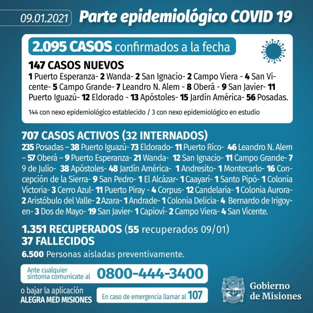 Por segundo día consecutivo la provincia de Misiones reportó más 100 casos de coronavirus. El parte epidemiológico del Ministerio de Salud Pública informó 147 nuevos infectados. Con los números de este sábado, la tierra colorada superó los 2.000 contagios desde el inicio de la pandemia.