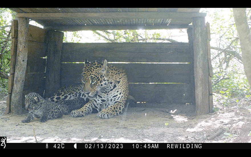La yaguareté de cautiverio Tania y uno de los últimos yaguaretés silvestres del Chaco, Qaramta, tuvieron nuevamente cachorros: esta vez fueron tres crías, nacidas alrededor del 2 de febrero de 2023, cuando la madre se recluyó a su madriguera. Generalmente los yaguaretés paren dos cachorros y esta es la primera vez que en los proyectos gestionados por Rewilding Argentina ocurre un nacimiento triple. Lamentablemente, uno de ellos —el más pequeño— falleció pocos días después de nacer, algo que sucede habitualmente en la naturaleza.