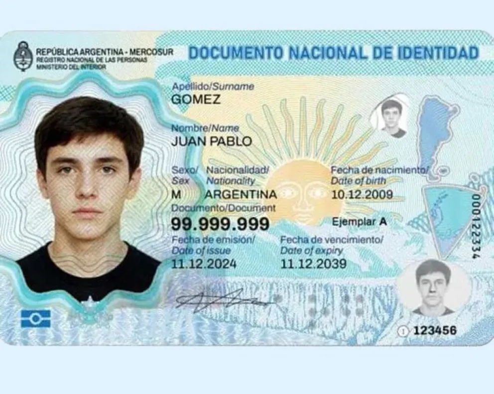 En el caso de mayores de 14 años, el DNI incluye el escudo nacional, la leyenda “República Argentina – Mercosur”, fotografía color, datos personales y firma.
