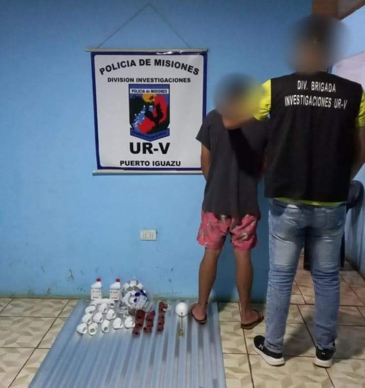 En Puerto Iguazú, los agentes de la División Investigaciones, en la averiguación de hechos cometidos contra la propiedad, secuestraron en inmediaciones de los barrios 1ro de Mayo y Bicentenario, 2 chapas de zinc, 2 plafones led, 12 caños codo, 2 envasases de adhesivos para caños y otros accesorios de desagüe para cañerías que fueron robados en el barrio Los cedros y Villa Florida. Asimismo, sobre la calle Marta Schwartz detuvieron al presunto autor de los ilícitos, un joven de 28 años.