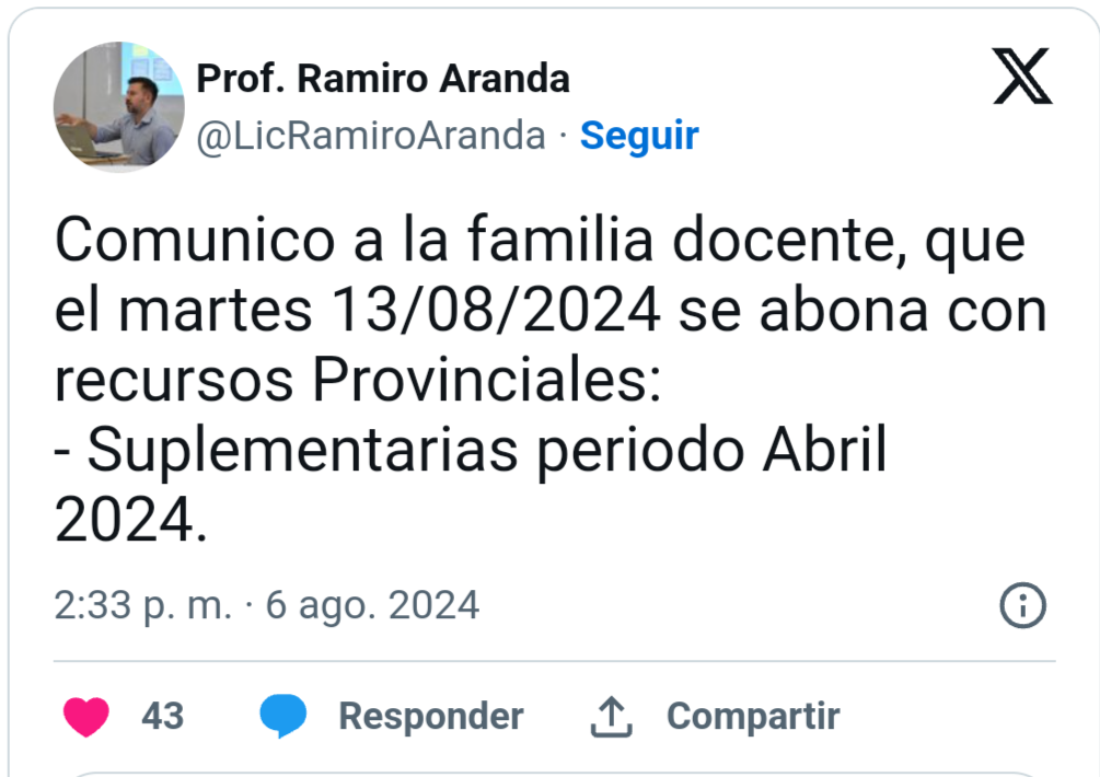 El Ministro de Educación de la Provincia de Misiones, Ramiro Aranda,El ministro de Educación de la provincia de Misiones, Ramiro Aranda, anunció a través de su cuenta oficial de X la fecha de pago de Suplementarias a docentes misioneros.