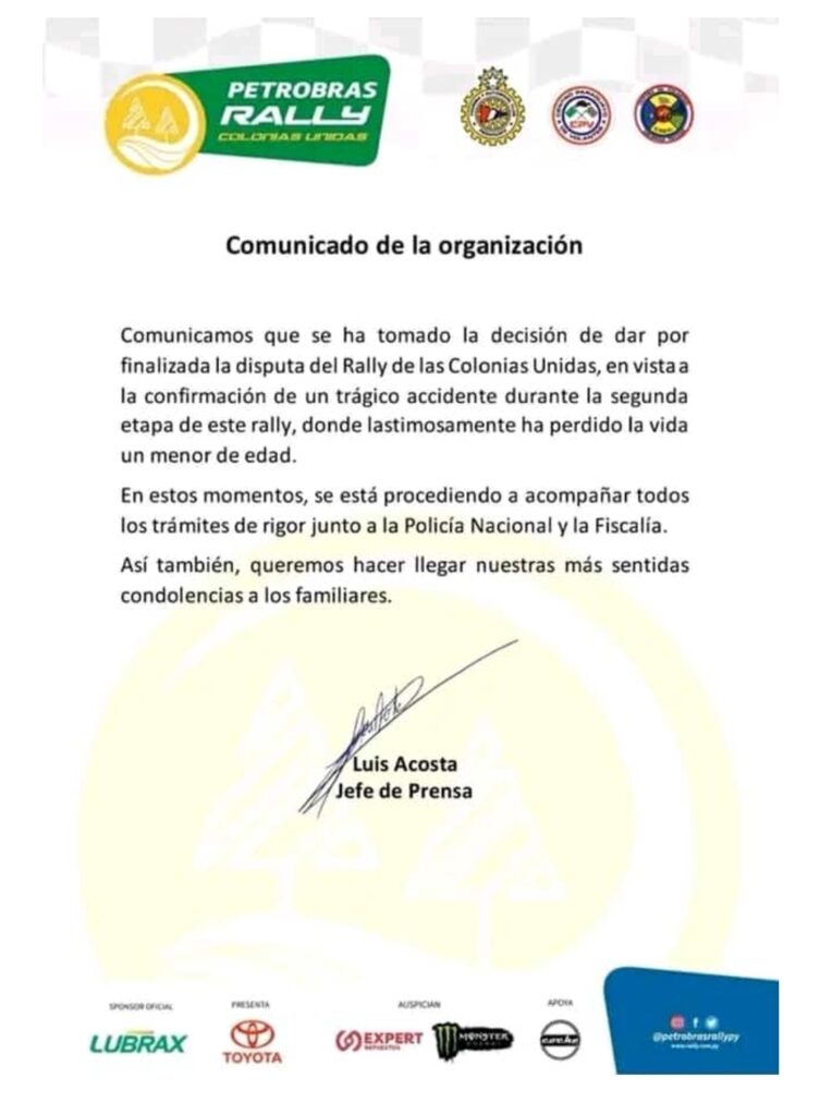 A través de un comunicado, la organización del rally en Colonias Unidas, Departamento de Itapúa, decidió suspender la competencia luego de confirmarse un trágico accidente durante la segunda etapa del rally, donde un niño misionero de seis años perdió la vida.