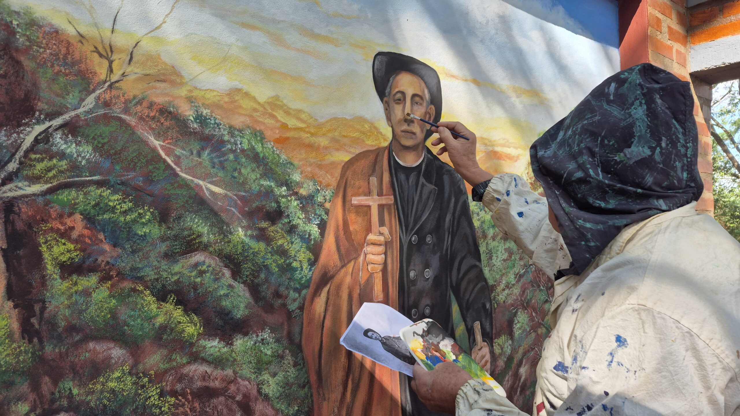 El trabajo, aún en proceso, ya ha despertado el interés de quienes pasan por la plaza y se detienen a observar los detalles de la imagen en construcción. La figura del «Cura Gaucho», como se lo conoce popularmente, empieza a emerger en la pared con la fuerza de un símbolo que une historia, fe y comunidad.