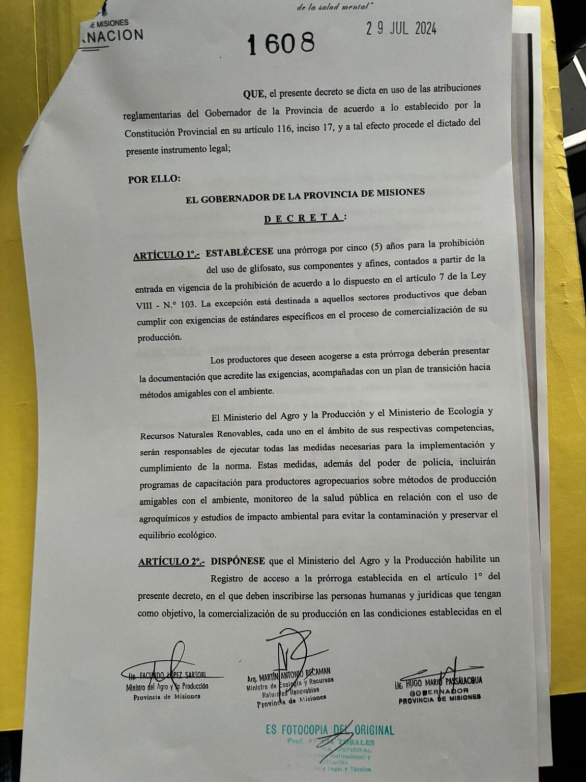 Luego de una serie de incesantes reclamos de parte de asociaciones de productores agropecuarios de Misiones – y del resto del país- el gobierno decidió dar marcha atrás con la prohibición del glifosato en todo su territorio, y decidió prorrogar la medida a 5 años, aunque los productores que requieran de este insumo, deberán cumplir normas.