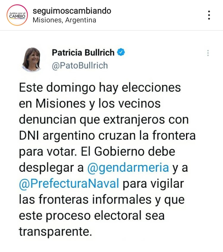 “Este domingo hay elecciones en Misiones y los vecinos denuncian que extranjeros con DNI argentino cruzan la frontera para votar. El Gobierno debe desplegar a Gendarmería y a Prefectura Naval para vigilar las fronteras informales y que este proceso electoral sea transparente”, dijo Bullrich en sus redes sociales.