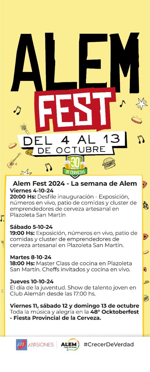 Se invita a la presentación oficial de “Alem Fest 2024”, evento que promete ser uno de los más destacados del año y que se desarrollará del 4 al 13 de octubre.