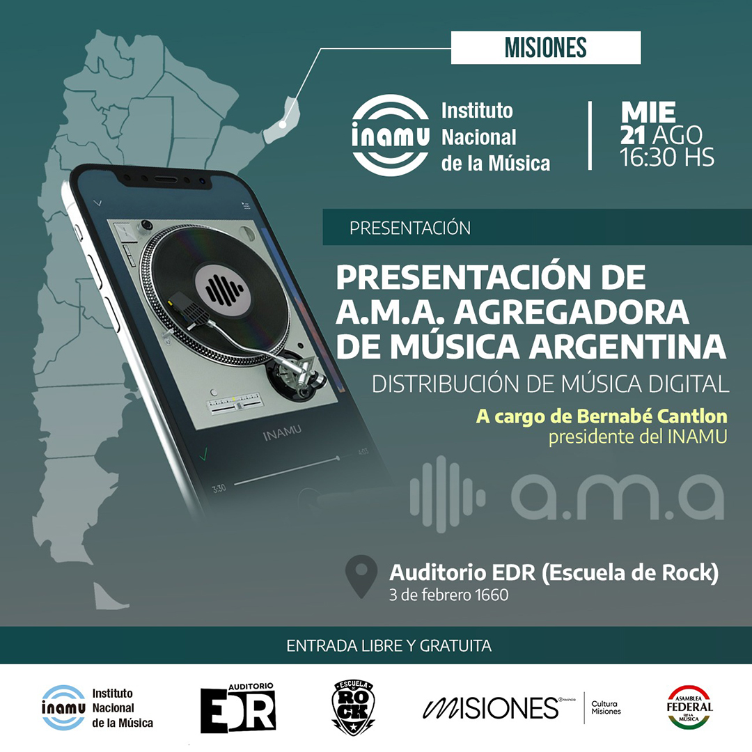 La presentación de A.M.A. -Agregadora de Música Argentina-se realizará con la presencia del presidente del Inamu, Bernabé Cantlon, el secretario de Estado de Cultura Joselo Schuap y el coordinador regional del Nea, Elio Ilkov. La cita es el miércoles 21 de agosto a las 16.30 hs, en el auditorio EDR (3 de Febrero 1660, casi San Martin), de Posadas.