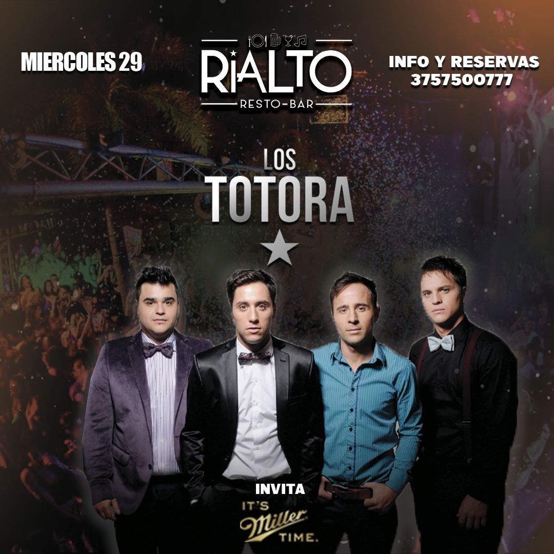 En la gran gira del Nordeste una de las bandas más importantes y conocidas del país, se presenta por segunda vez en la ciudad de las Cataratas, en el mismo lugar pero ahora bajo el nombre RIALTO RESTO BAR, «LOS TOTORAS» en exclusivo, único show.