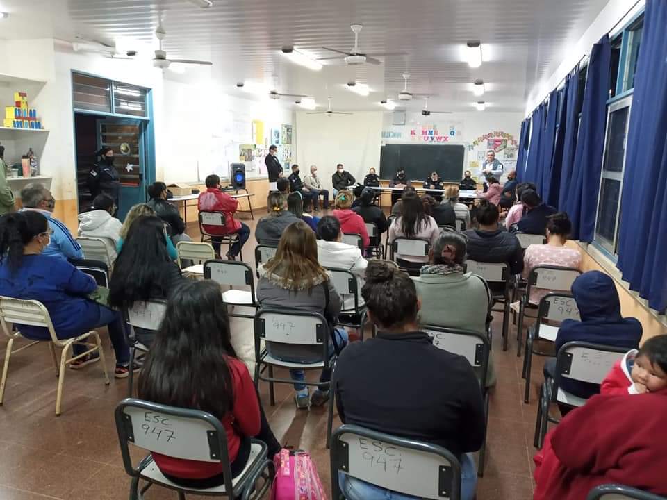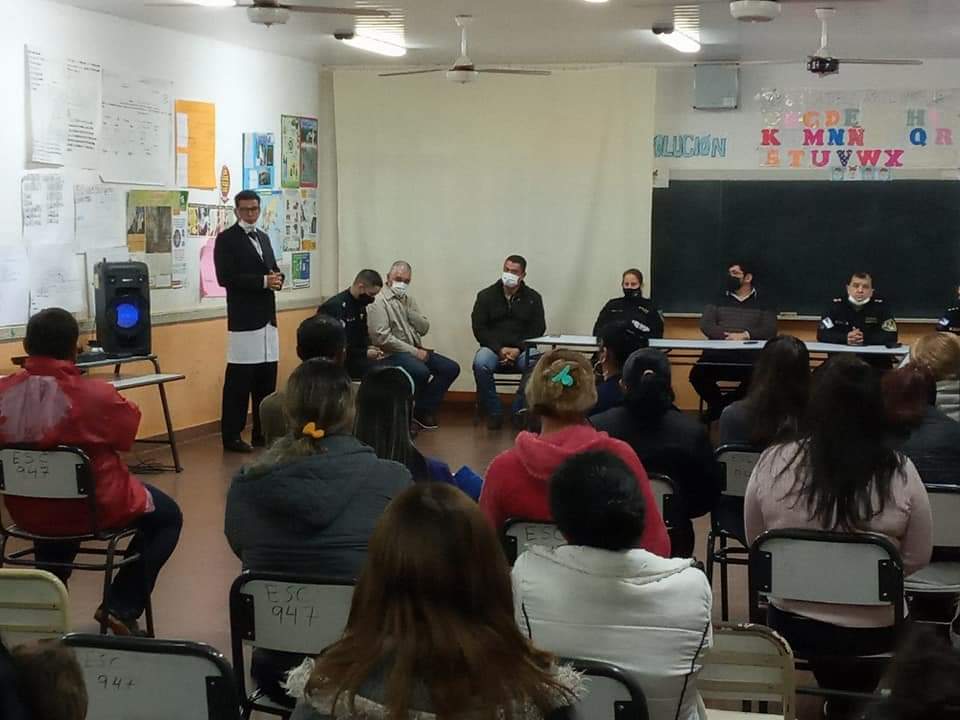 En el establecimiento escolar Nro. 947 del barrio 25 de Mayo de esta ciudad en la tarde de hoy el comisarío Mayor Daniel Alonso Jefe de la Policía Comunitaria URV, la señora Jefa de la Comisaría seccional Cuarta, de la Comisaría de la Mujer, de la División Drogas Peligrosas y equipo de profesionales de la URV brindaron charlas de concientización y prevención de adicciones donde se abordaron específicamente la prevención y los alcances de la ley.