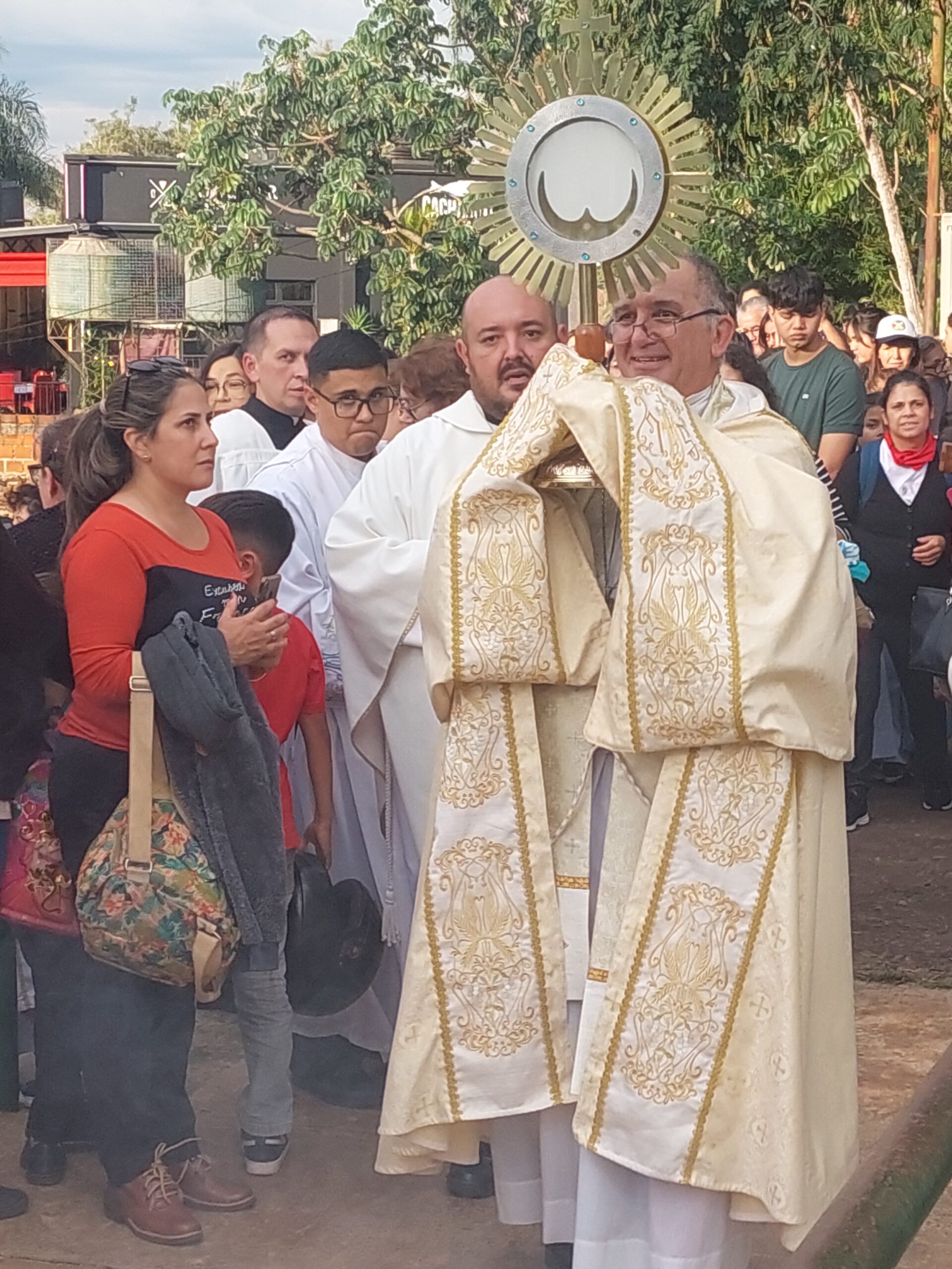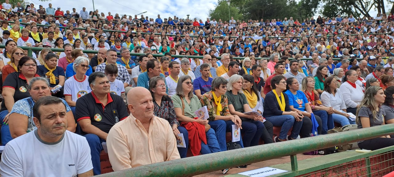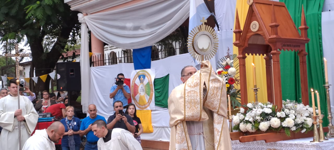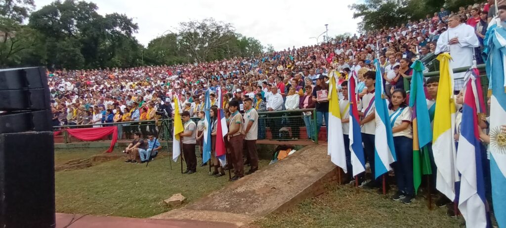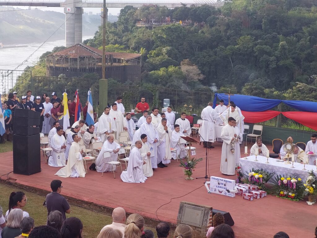La santa misa de la que participaron fieles de toda la Diócesis de Puerto Iguazú se celebró en el Anfiteatro Ramón Ayala – en el Hito de las Tres Fronteras – la misma fue presidida por el Monseñor Nicolás Baisi junto a todos los sacerdotes parroquiales, seminaristas y diáconos.