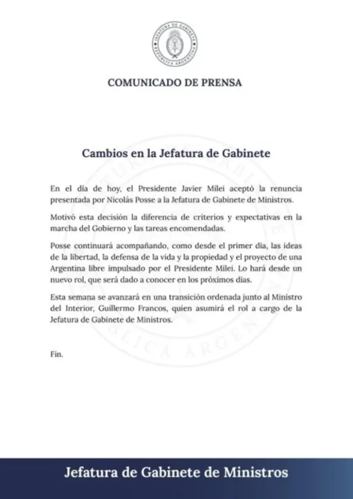 Nicolás Posse presentó su renuncia a la Jefatura de Gabinete y el Presidente Javier Milei se la aceptó.