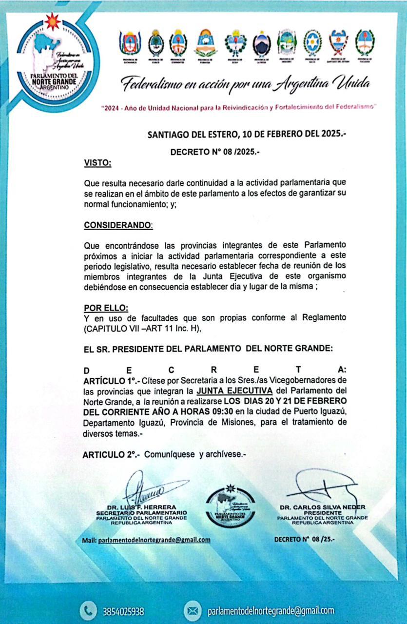Los días 20 y 21 de febrero, Puerto Iguazú será sede de la reunión de la Mesa Ejecutiva del Parlamento del Norte Grande, un espacio clave para el debate y la construcción de políticas en la región.