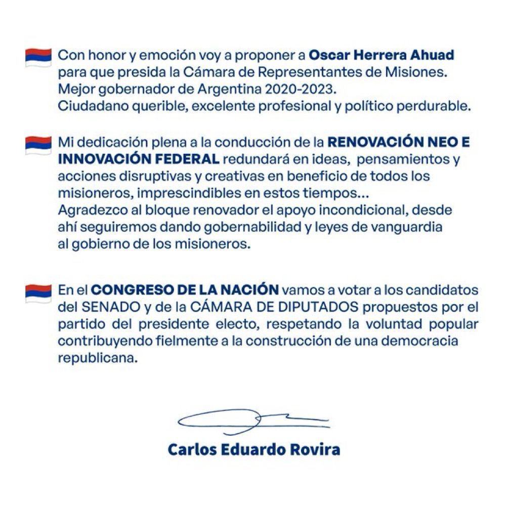A través de un comunicado el actual presidente de la legislatura provincial notificó que propondrá a Oscar Herrera Ahuad actual Gobernador de la provincia, como el próximo presidente del cuerpo, además de reconocerlo como el mejor Gobernador de Argentina 2020-2023, sumado a otras valoraciones como “Ciudadano querible, excelente profesional y político perdurable”, que utilizó el conductor de la Renovación para calificarlo.