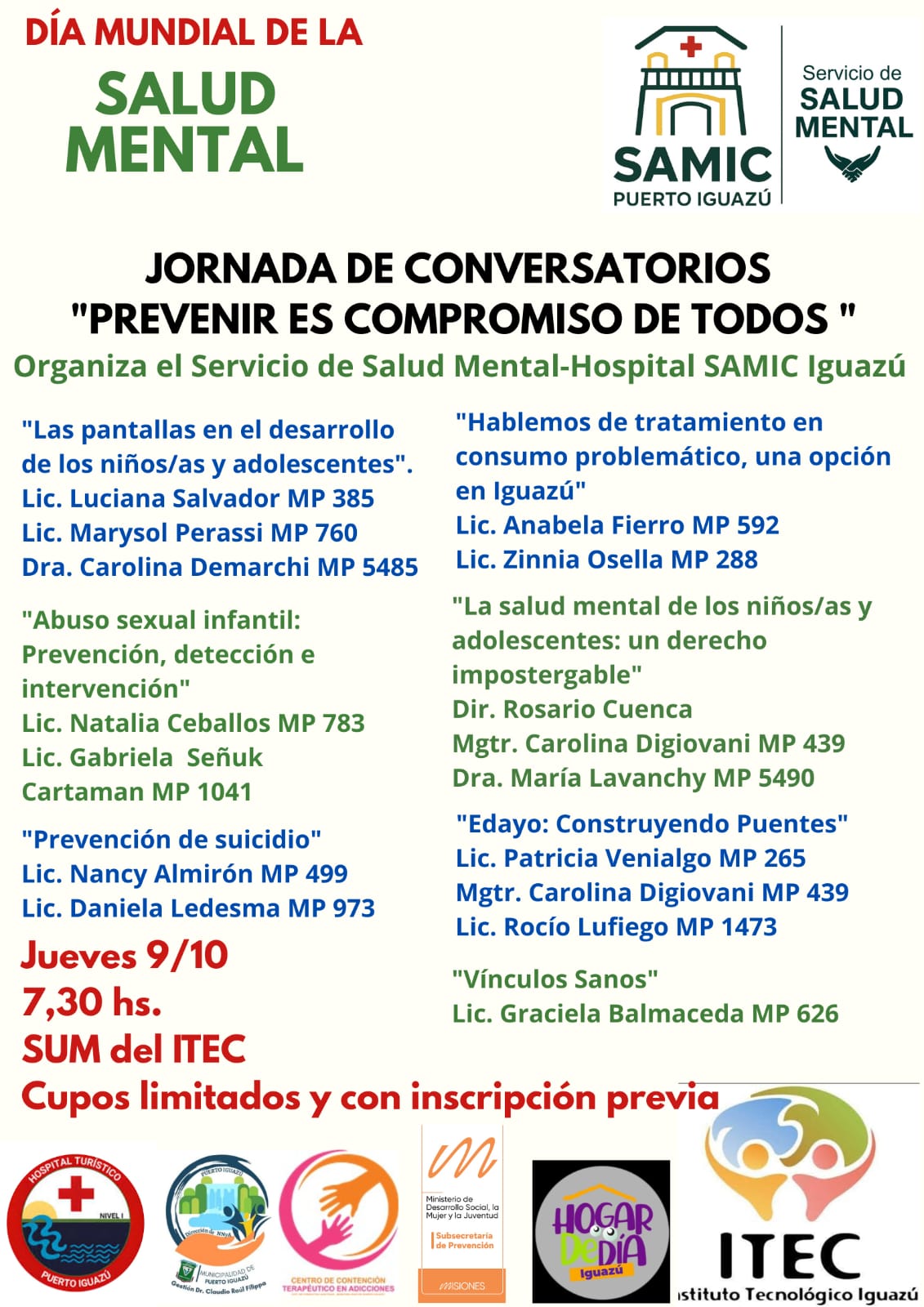 En el marco del Día Mundial de la Salud Mental, el Servicio de Salud Mental del Hospital SAMIC Puerto Iguazú llevará adelante este jueves 9 de octubre, a partir de las 7:30 horas en el SUM del Instituto Tecnológico Iguazú (ITEC), una jornada de conversatorios bajo el lema “Prevenir es compromiso de todos”.