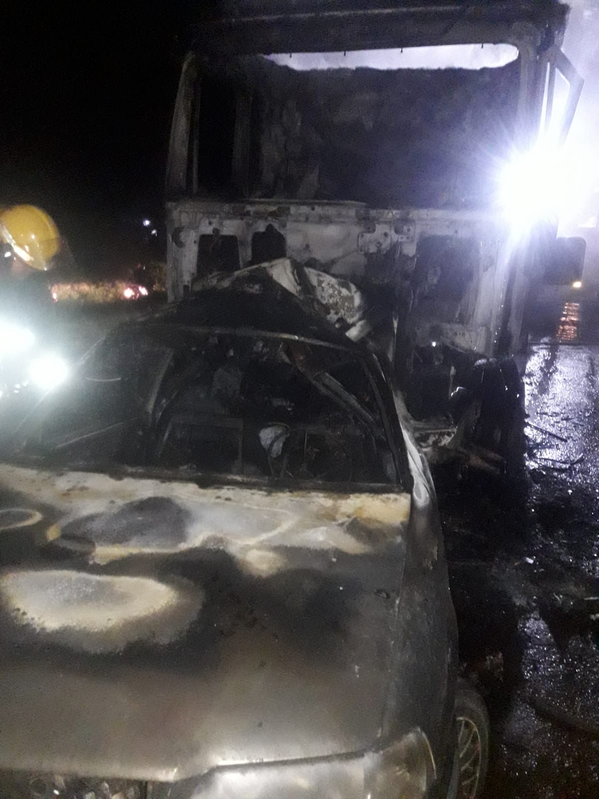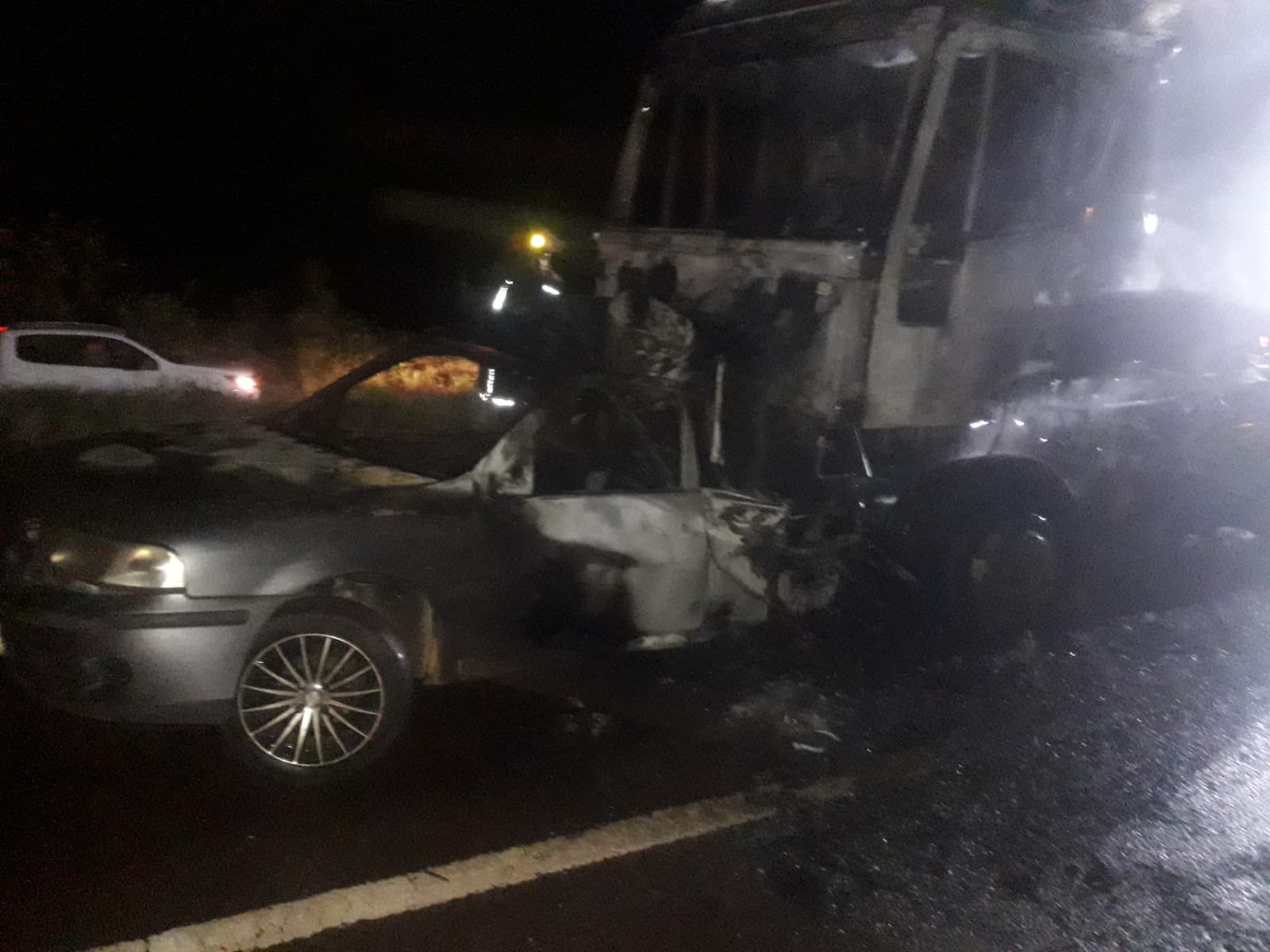 El siniestro ocurrió pasadas las 19 horas de este domingo en el kilómetro 1.414 de la Ruta Nacional 12 en Santo Pipó, donde por causas que son peritadas, un camión impactó la parte trasera de un auto, iniciándose luego el incendio de los vehículos involucrados.