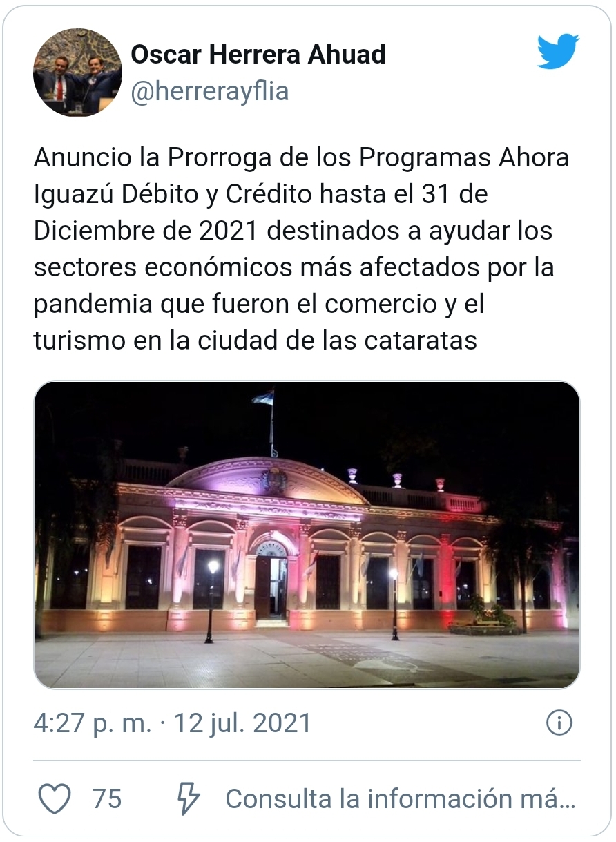 La noticia sobre la extensión de los beneficios correspondientes a los programas Ahora Iguazú Débito y Crédito fue realizada a través de la cuenta de Twitter del gobernador Oscar Herrera Ahuad.