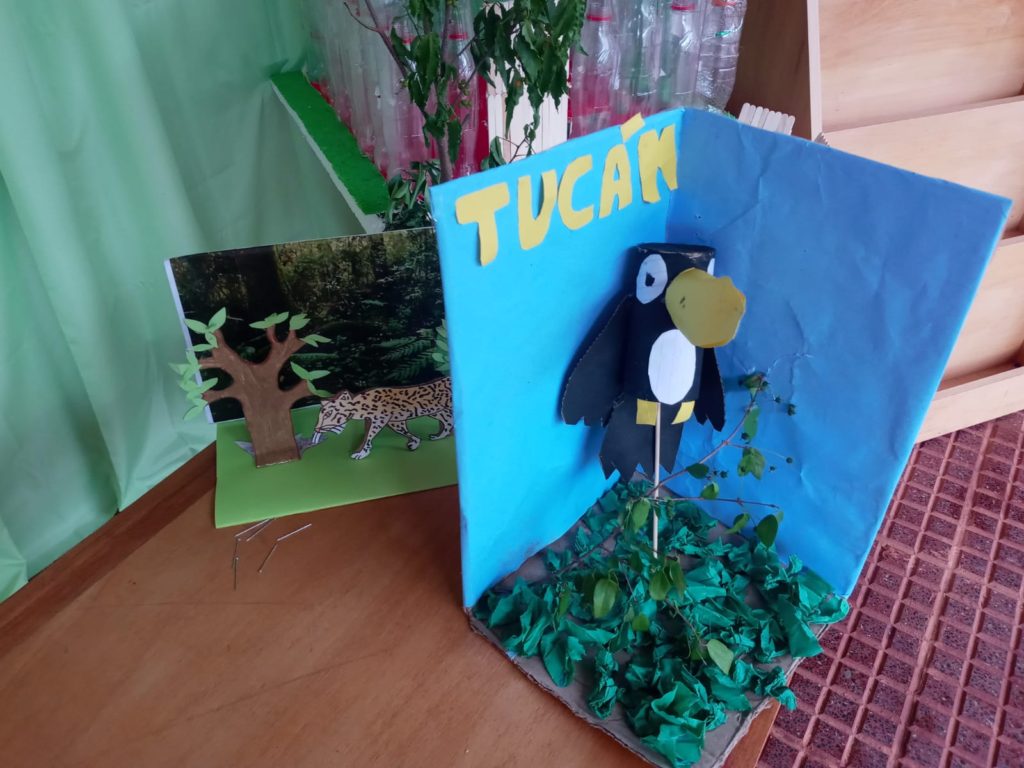 Así también realizaron cuadros en collage de animales típicos de la Selva Misionera como así también elaboraron con materiales descartables tucán, yaguarete, mariposa, etc.
