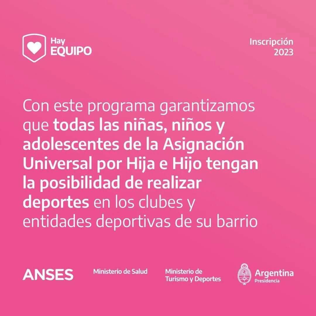 El Programa Nacional “Hay Equipo” es una política pública desarrollada de manera conjunta entre el Ministerio de Turismo y Deportes, el Ministerio de Salud y la ANSES, que busca garantizar el acceso de chicas y chicos, de entre 5 y 17 años, a instituciones deportivas, consideradas espacios de pertenencia, recreación y desarrollo.
