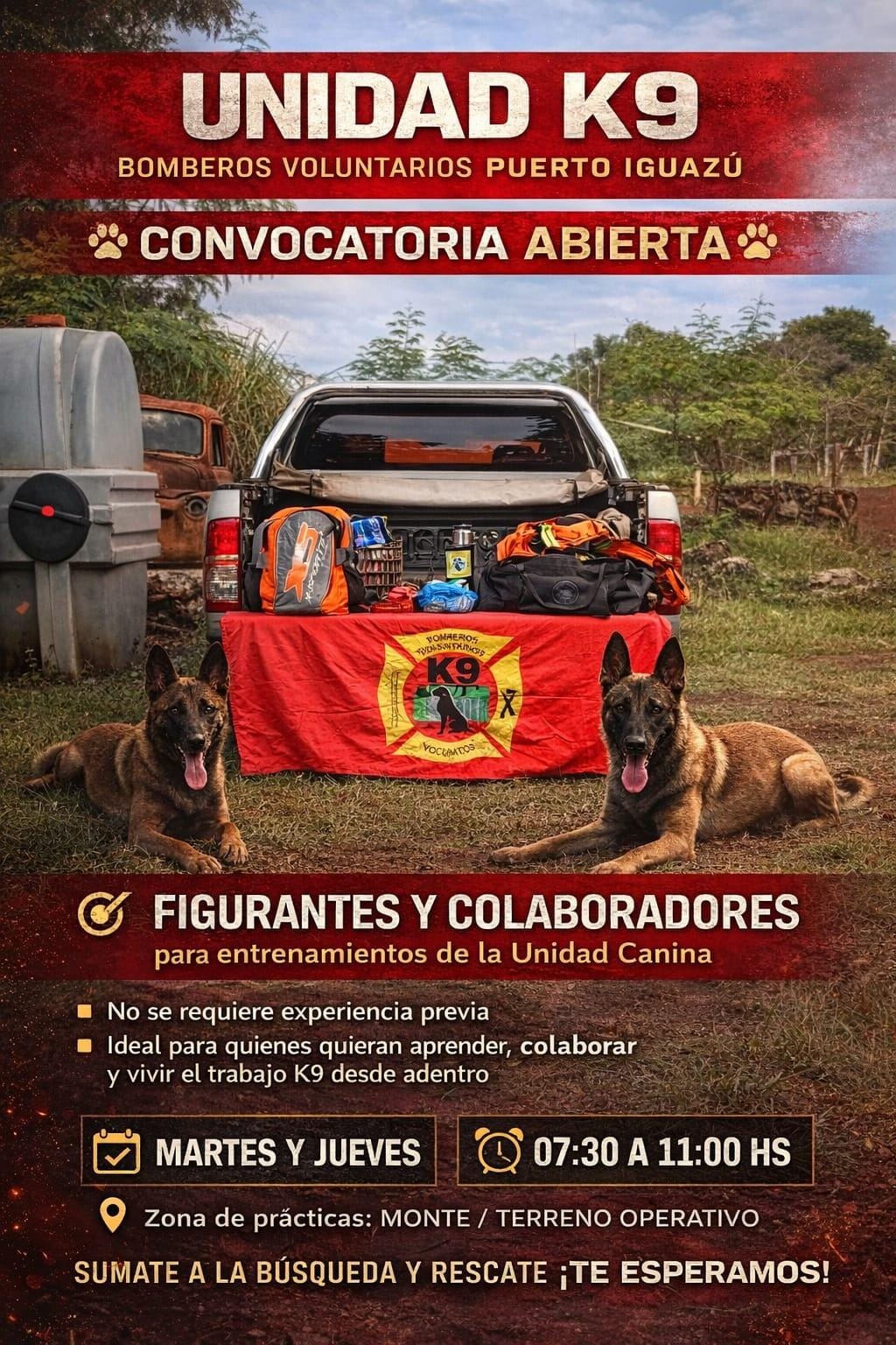 La Unidad Canina de los Bomberos Voluntarios de Puerto Iguazú lanzó una convocatoria abierta dirigida a vecinos que deseen participar como «figurantes» y colaboradores en sus jornadas de entrenamiento de búsqueda y rescate.