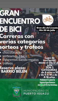 La ciudad se prepara para una jornada llena de adrenalina, sorteos y espíritu deportivo. El próximo sábado 20 de julio, el Barrio Belén será sede del gran encuentro de bici, un evento organizado por la Municipalidad de Puerto Iguazú que reunirá a niños, jóvenes y familias en una competencia que promete ser inolvidable.