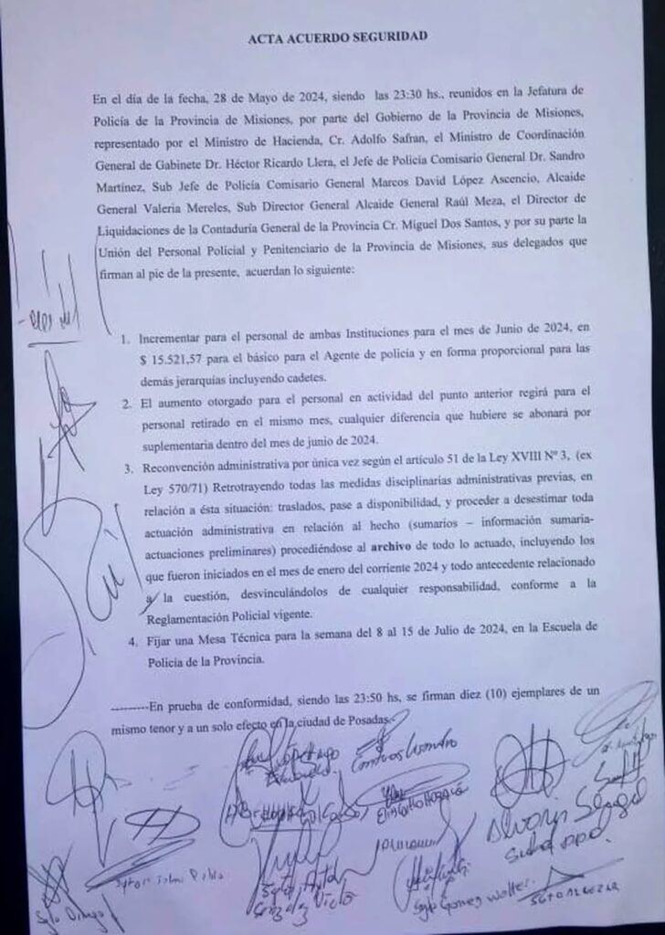 Pasadas las 23 del martes Ramón Amarilla, suboficial Mayor retirado, comunicó que Sandro Martínez, Jefe de la fuerza, los había convocado para hacerles una nueva propuesta salarial, oferta que fue aceptada y cuya acta fue firmada por los delegados tras dos horas de reunión.