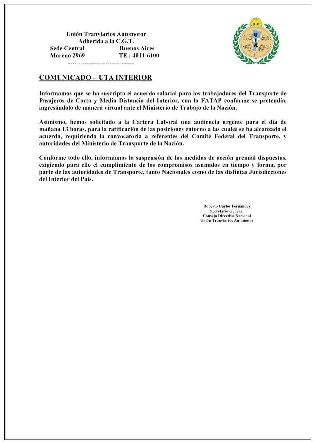 “Que se ha suscripto el acuerdo salarial para los trabajadores del Transporte de Pasajeros de Corta y Media Distancia del Interior, con la FATAP conforme se pretendía”, reza el comunicado oficial.