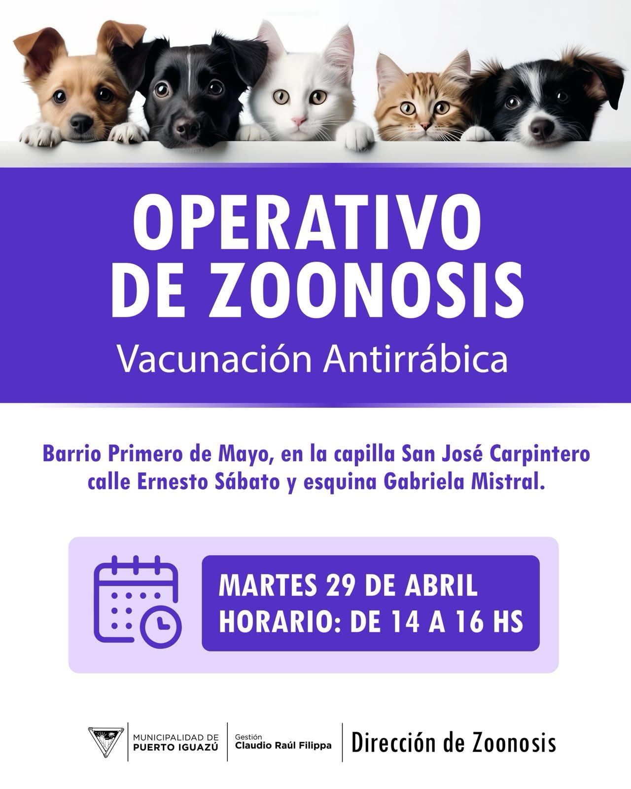 En el marco del Día del Animal, la Dirección de Zoonosis llevará adelante este martes 29 de abril una jornada especial de vacunación antirrábica gratuita destinada a perros y gatos.