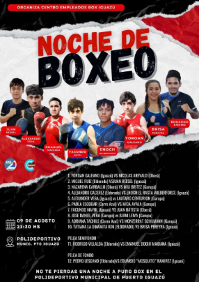 La organización de la velada boxística a cargo del Centro Empleados BOX de los entrenadores Ariel GONZALEZ y Walter FRUTOS, quienes con entusiasmo, invitan a toda la comunidad de Iguazú a participar y apoyar a los deportistas que con mucho esfuerzo y sacrificio en el gimnasio trabajan a diario, para poder llegar a una instancia competitiva como el de este próximo sábado, donde estarán presentes varios atletas del gimnasio, como también del WUKONG TEAM del entrenador Jorge Pumita VILLALBA, con sus competidores.